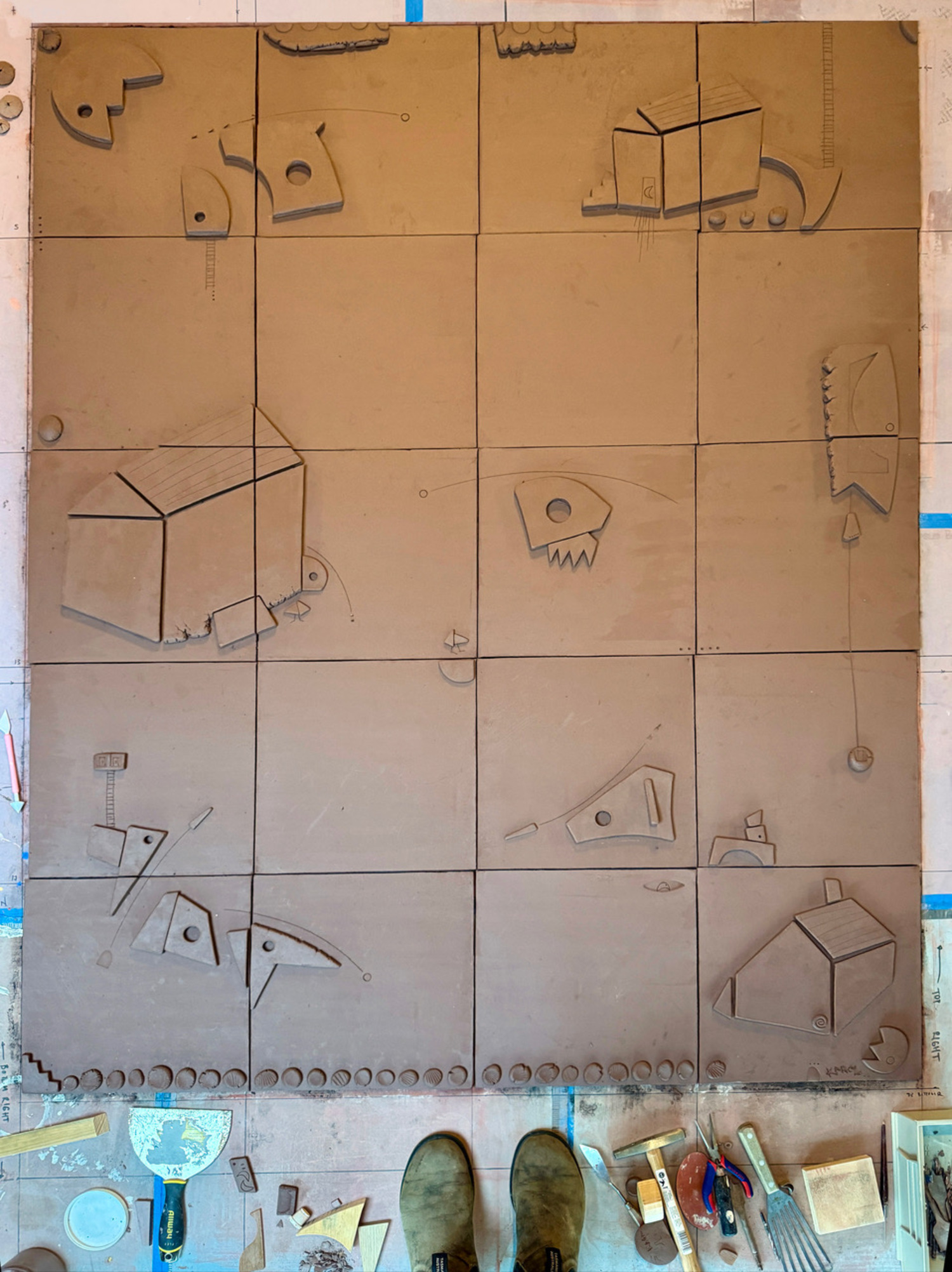 “I make these ceramic reliefs to tell stories — it could be an interpretation of a myth or a fantastical map of some real or perceived environment,” Karol said. “This ceramic work for Duck Creek depicts its architecture as well as the sculptures on the grounds, along with stories, memories and fantasies.”