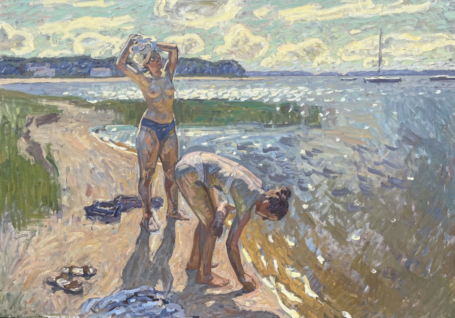 Fenske studied the Russian method of painting and has drawn influence from Russian Impressionists, particularly in his figurative compositions such as “Bathers (Inspired by Plastov),” which depicts individuals in relaxed outdoor settings.