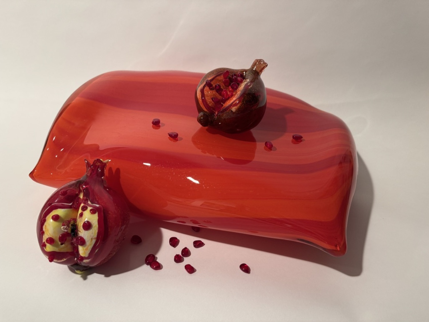 The exhibition’s five artists each engage red differently. Harvest’s glass sculptures — from plush pillows to ripe pomegranates — showcase red as an irresistible invitation to look closer. Brody-Lederman offers poetic glimpses of landscapes, birds and flowers, where touches of red reveal beauty in the everyday. Wickersham uses acrylic paint with dyed silk to create translucent layers of color and texture. Van Milders brings empathetic observation to her portraits, where red adds nuance and attitude. The late Hildy Maze explored emotional landscapes through introspective figures who suggest someone we might know or ourselves.