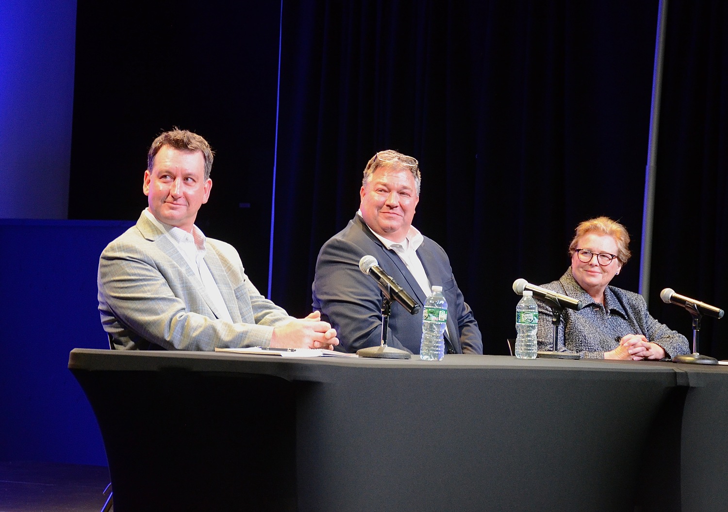 The two candidates for East Hampton Town Clerk, Jeff Miller, seated left, and Michael Hansen, seated right, wait for a question from Express News Group Executive Editor Joe Shaw, who moderated the debate on Monday night. KYRIL BROMLEY