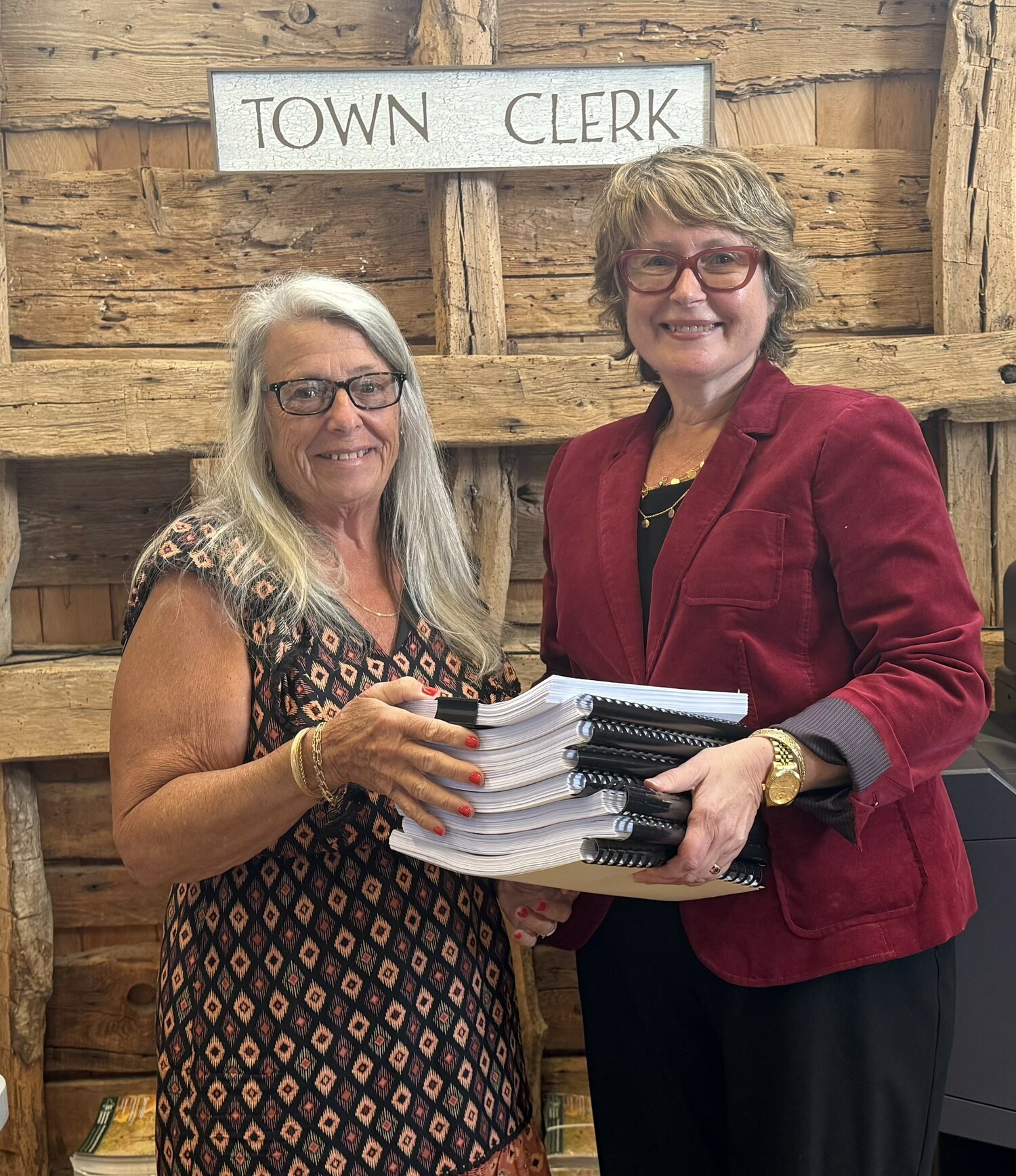 East Hampton Town Supervisor Kathee Burke-Gonzalez, right, drops the 2026 tentative budget off at the town clerk's office. This year will be the last it falls into the hands of Town Clerk Carole Brennan, who plans to retire at the end of this year. COURTESY EAST HAMPTON