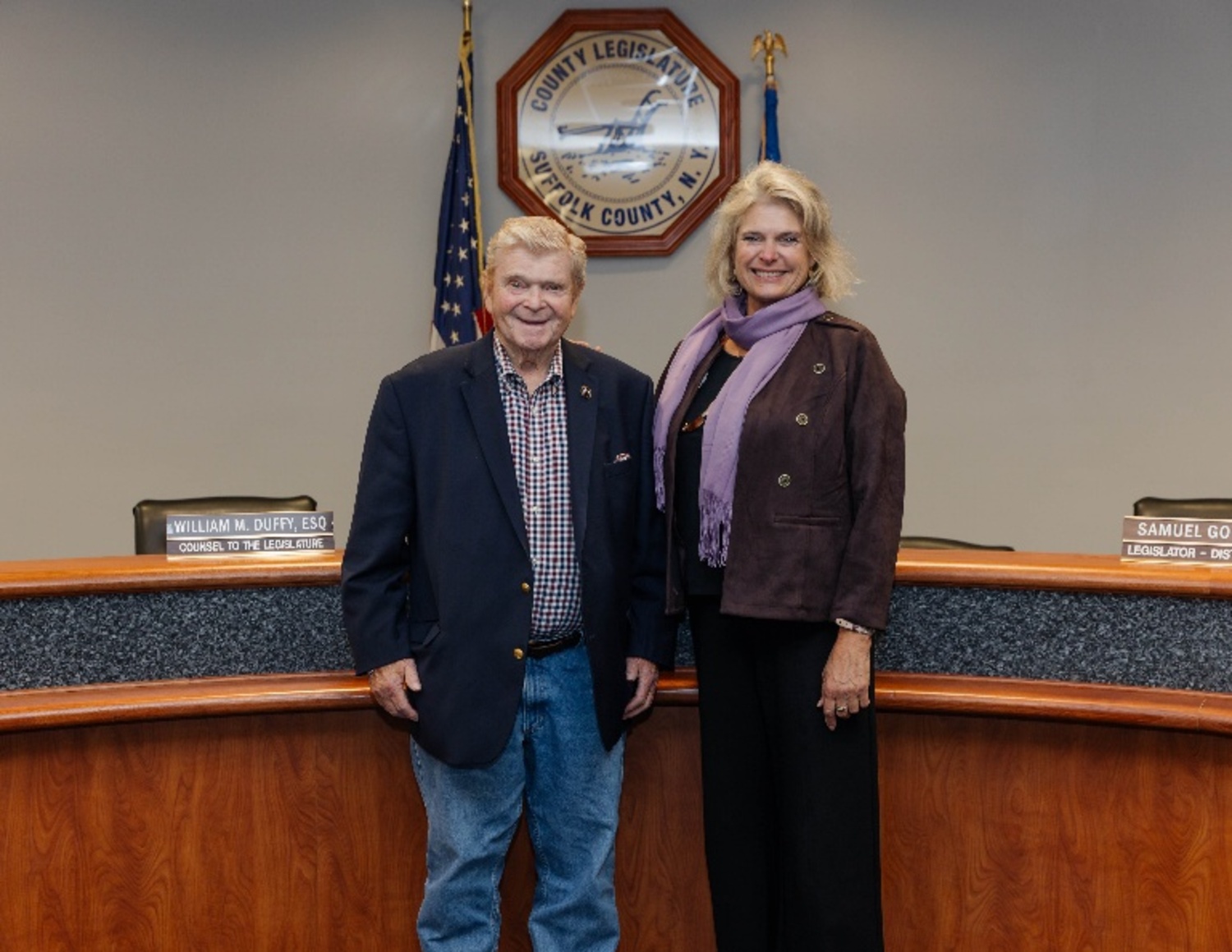 Richard “Dick” Fox White Jr. with Suffolk County Legislator Ann Welker. White was honored by the Legislature for his years of service to the county parks board.