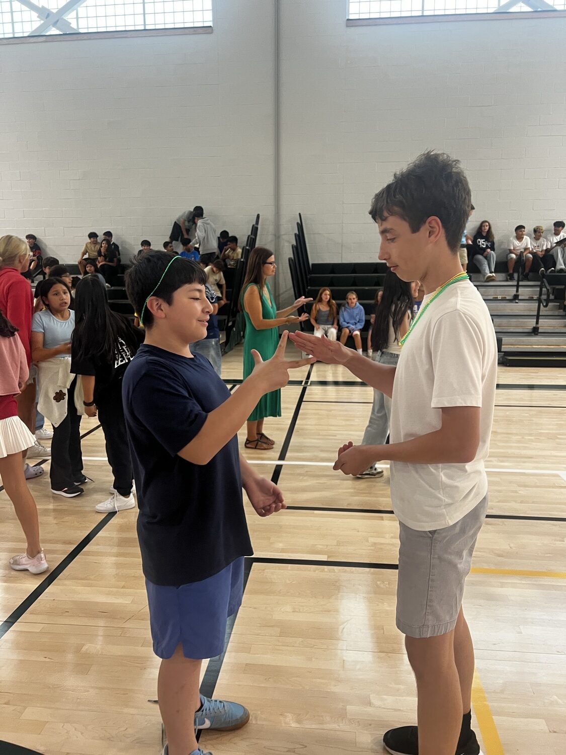 Seventh-grader Tomas Cruz and eighth-grader Wyatt Musser enjoy playing Rock, Paper, Scissors for SOAR points during a recent pep rally. TOBY MACKEY