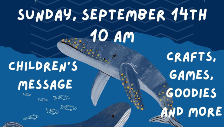 We are inviting all children and families in for a “Whale of a Day” on Sunday, September 14th at 10 AM. There will be a children’s message, crafts, goodies, games and more. We hope to encourage children to participate in our Sunday School program throughout the year but even if you're there for just one Sunday or a year of Sundays you are welcome.