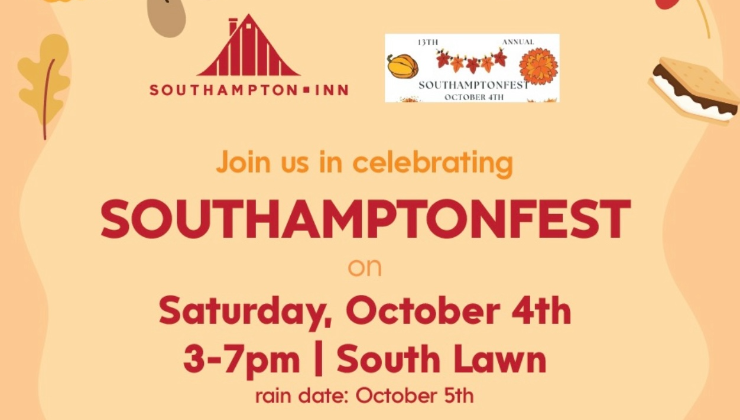Join us for our annual celebration of Southamptonfest at the Southampton Inn. The festivities are Saturday, October 4th from 3-7pm on the South Lawn. Pumpkin carving, painting, firepits, smores, full bar, apple cider & more!