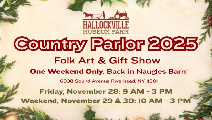 Visit Hallockville Museum Farm and experience the transformation of its historic barn into a holiday wonderland and unique shopping experience. The Hallockville Country Parlor features exclusively handcrafted gift items, artwork, and holiday décor created by local artisans and craftspeople. Among the array of beautiful, authentic handmade items will be pottery; baskets; tree ornaments; quilted, knit, and woven apparel and home décor; paintings; candles; soaps; and much more!
