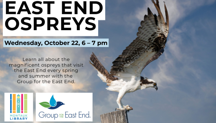 Learn all about the magnificent ospreys that visit the East End every spring and summer with the Group for the East End. Jennifer Skilbred, assistant director of environmental education, will present on the history of the osprey on Long Island, their nesting behavior and favored habitats, threats, and the Group for the East End's conservation programs that protect our local populations.