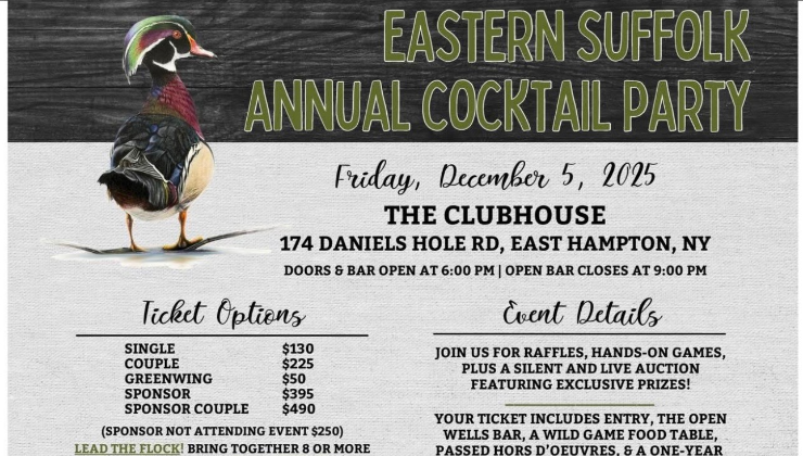 Eastern Suffolk Ducks Unlimited Annual Cocktail Party Friday December 5, 2025 The Clubhouse 174 Daniels Hole Road, East Hampton, NY Doors & Bar Open at 6:00 PM - Open Bar Closes at 9:00 PM For Tickets call Heather Sachtleben at 631- 599-2221