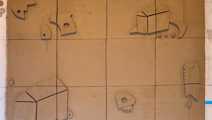 Karol’s new ceramic works depict a fantastical map of Duck Creek’s property—tracing its architecture, natural features, and sculptures through the artist’s distinctive sculptural language. Combining impressions, cut forms, and inscriptions, these reliefs invite visitors to explore the site as both a landscape and a narrative space.