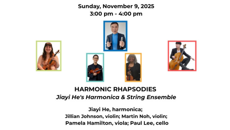 Jiayi He's Harmonica & String Ensemble will perform masterworks by classical composers such as Massenet, Rimsky-Korsakov, Tchaikovsky, and Chopin, as well as music by contemporary composers including Ennio Morricone, Stevie Wonder, U2, and others. This special concert is suitable for family audiences.