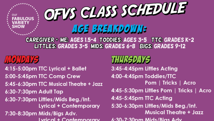For a full list of classes, rates and discount information, or to register, visit www.ofvs.org/register or contact Our Fabulous Variety Show at nicole@ofvs.org or by calling 631-507-4603.