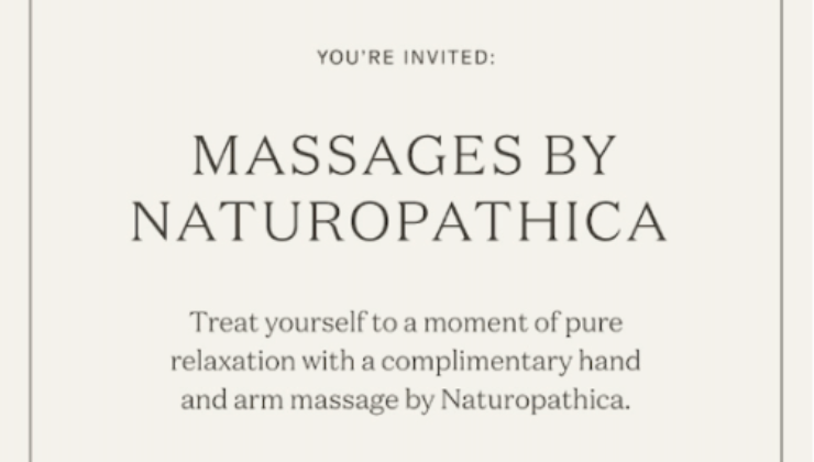 An afternoon of rejuvenation from NATUROPATHICA, offering complimentary ten-minute hand and arm massages in-store while you shop on Thursday, August 14 from 12:00-2:00PM. Shoppers can browse Jenni Kayne's luxurious and elevated basics at 10% off, enjoy some relaxation from NATUROPATHICA and snack on pastries and bites from the James Beard Award-winning bakery Carissa’s. With limited availability for the mini-treatments, those planning to stop by can reserve their time by emailing amagansett@jennikayne.com.