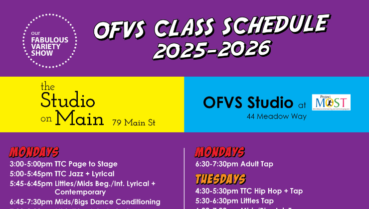 For a full list of classes, rates and discount information, or to register, visit www.ofvs.org/register or contact Our Fabulous Variety Show at nicole@ofvs.org or by calling 631-507-4603.