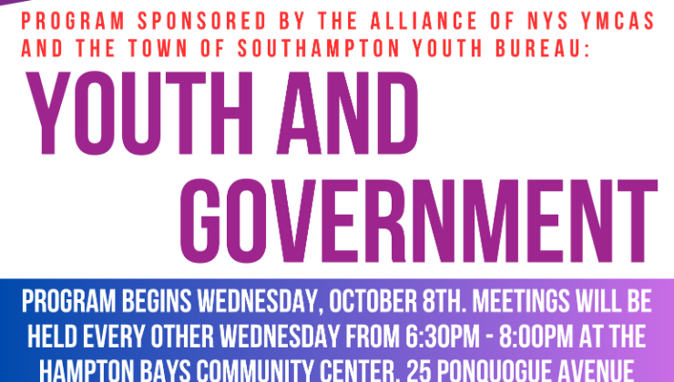 Registration is now open for The Town of Southampton Youth Bureau’s “Youth and Government” program sponsored by the Alliance of NYS YMCAs. Students in grades 9–12 have the opportunity to develop their own bills to amend legislation as well as discuss and debate issues that affect citizens of New York State. The program culminates in a three-day statewide conference in Albany where students deliberate in the chambers of the NYS Legislature. The Southampton Youth Bureau’s Youth & Government program begins Wednesday, October 8. Meetings are held every other Wednesday from 6:30 PM – 8:00 PM at the Hampton Bays Community Center, 25 Ponquogue Avenue. For more information or to register, please call (631) 702-2425 or visit www.southamptontownny.gov/ybpayment.