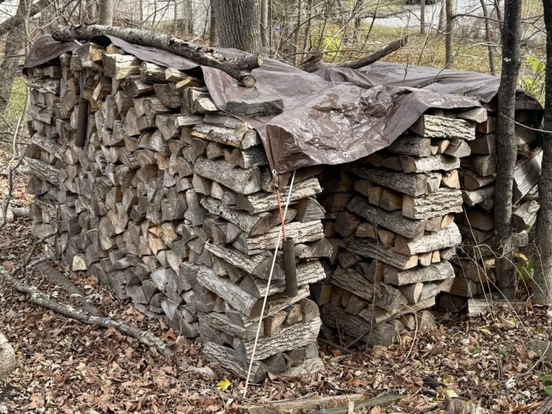 You can accelerate the curing of firewood by splitting it and letting it dry under a simple lean-to type of structure. It can have three sides and a roof, or just a roof, but the trick is to have it about 8 inches above the last row of wood so that air is always circulating and moisture is always evaporating. You can further accelerate the drying process by making the roof out of 4 mil clear plastic, but again, the plastic should not sit on the wood. Rather, the plastic needs to be above the wood so that the air moves freely out of the structure. This allows solar energy to penetrate into the pile and speed up drying while still keeping rain and snow off it. No matter what you do, don’t just take a tarp and throw it over the wood. This will effectively trap moisture and slow or stop the drying. You are better off with no cover at all instead of a tarp.