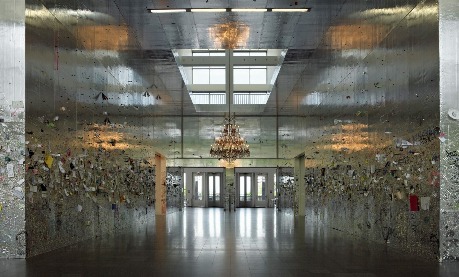 Stingel’s “Untitled (2025)” consists of a wall clad entirely in Celotex — aluminum-faced foam insulation panels that glimmer with a metallic sheen. Unlike most museum works that prohibit even the lightest touch, this installation encourages direct interaction. Visitors are invited to press, scratch, and draw into the surface, leaving their own marks in dialogue with those who came before. Over time, the piece will gather a dense web of impressions — part drawing, part graffiti, part palimpsest — creating a collective record of presence and participation.