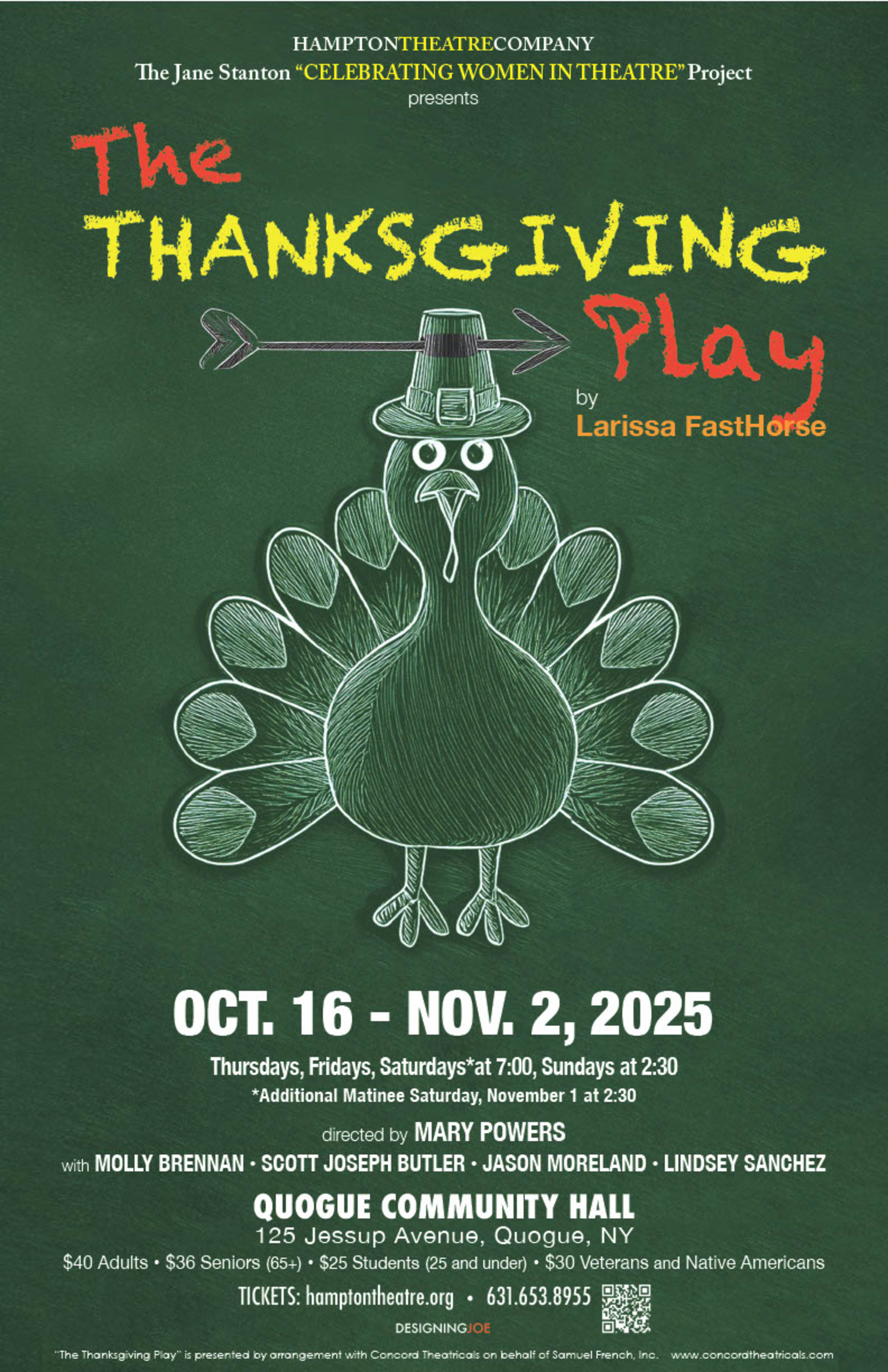 The project begins October 16 to November 2 at the Quogue Community Hall with Larissa FastHorse’s sharp-witted satire “The Thanksgiving Play,” directed by Mary Powers. The comedy follows a group of well-meaning educators attempting to stage an inclusive Thanksgiving pageant, only to unravel in spectacularly misguided ways.
