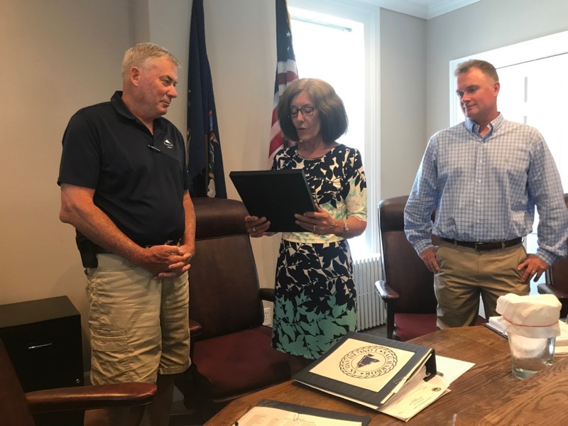 Sag Harbor Mayor Sandra Schroeder presents Ed Deyermond with a proclamation Tuesday night, while Trustee Ken O’Donnell looks on. Kathryn G. Menu photo[/caption]