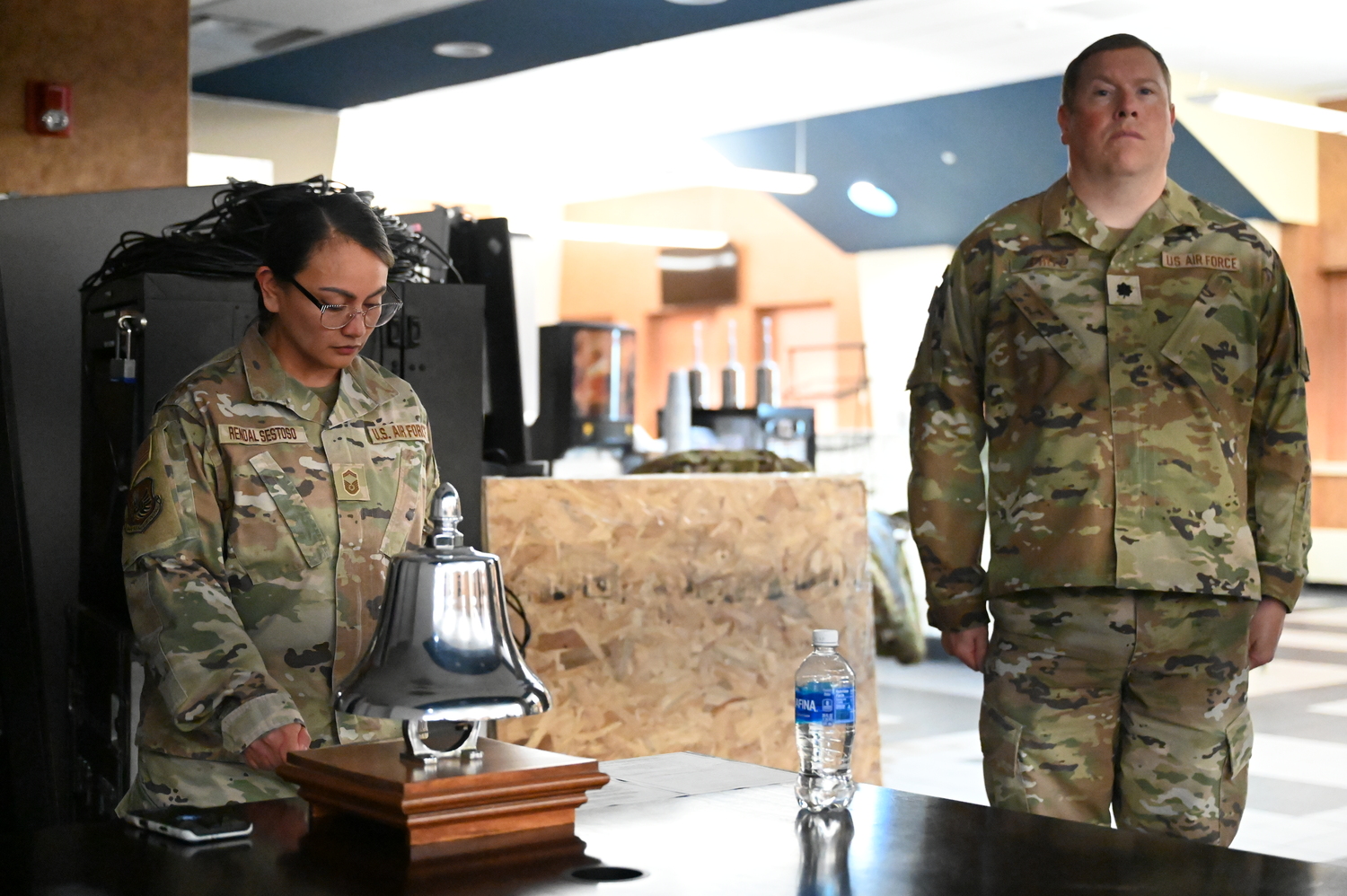 U.S. Air Force Senior Master Sgt. Elisha Rendal Sestoso, 106th Rescue Wing Safety Manager, and Lt. Col. Jesse Fritz, 106th Rescue Wing Chief of Staff, ring a bell following a reading of the names of fallen members of the 106th during an inaugural Day of Remembrance ceremony on Francis S. Gabreski Air National Guard Base.