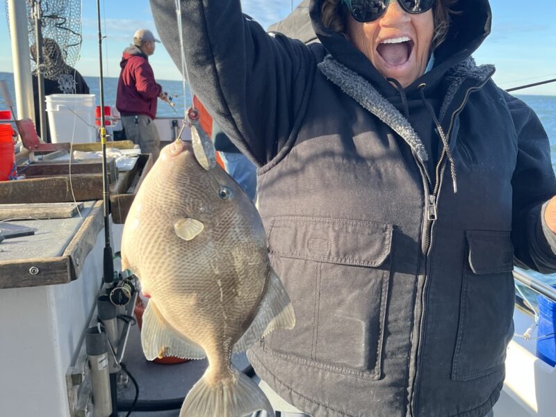 Dottie MacPhereson is understandably excited about this nice bonus triggerfish she caught while out hunting blackfish aboard the Shinnecock Star off Hampton Bays. Triggers are a delicious addition to any creel of edibles. DEENA LIPPMAN