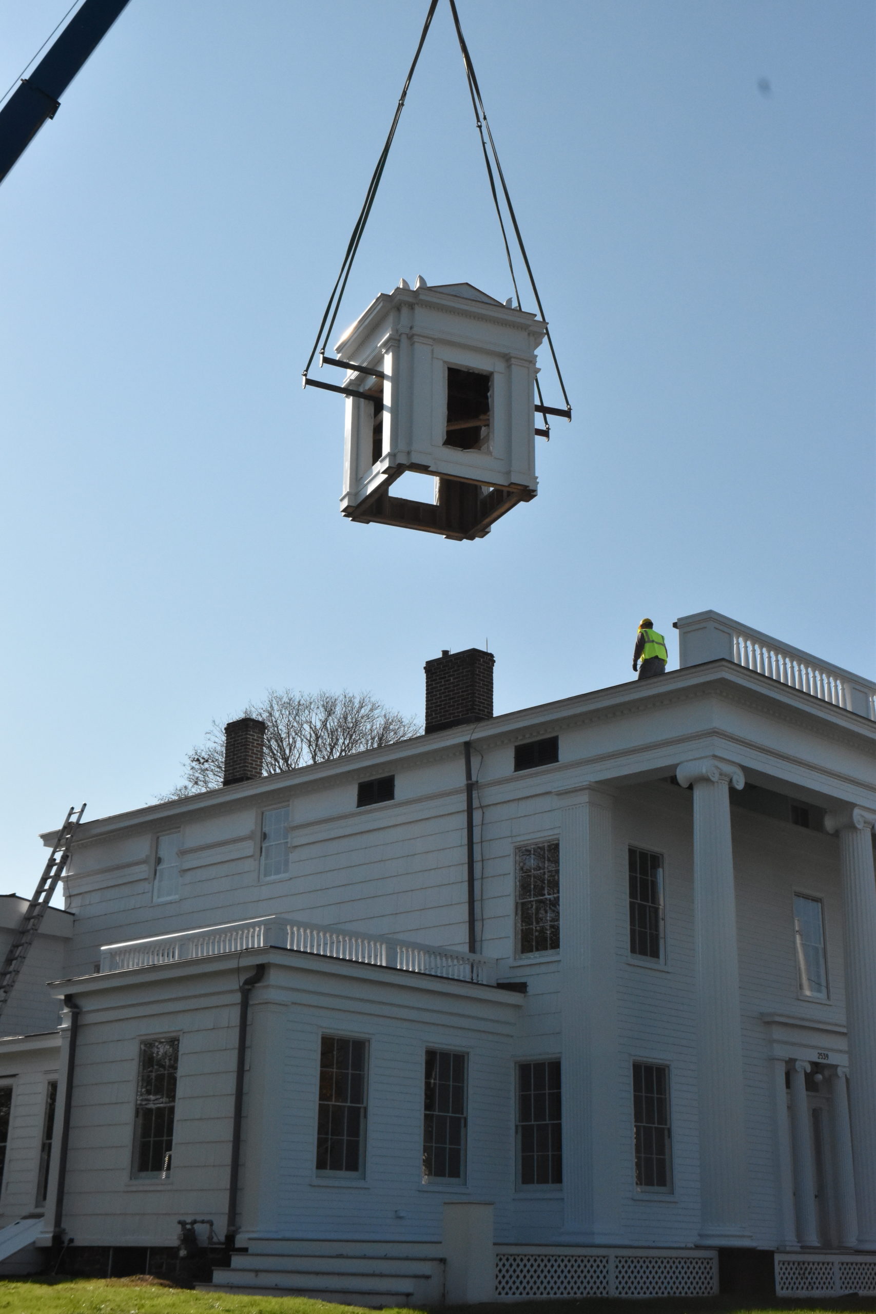 A crane lifted the cupola of the Nathaniel Rogers House back into position on Wednesday, November 4. STEPHEN J. KOTZ