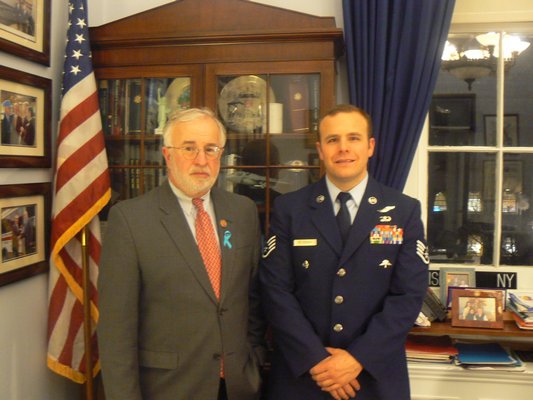 Staff Sergeant Christopher Petersen of Commack, a member of the ANG based at Gabreski Airport in Westhampton—and a “local hero,” Mr. Bishop said—made the trek to the nation’s capital to hear the president’s speech on January 28.