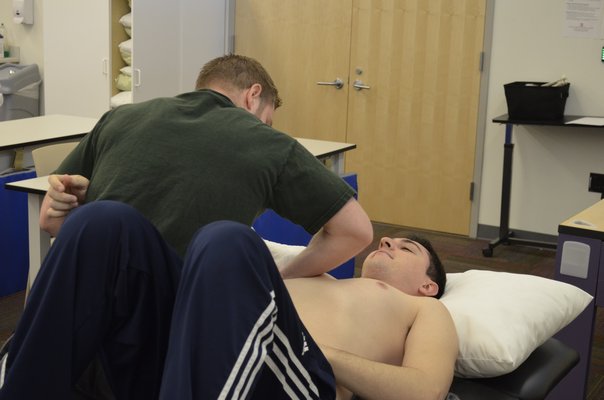 Second year physical therapy student John Kudreyko practices a shoulder joint mobilization technique on his classmate, Nick Byrne. BY ERIN MCKINLEY