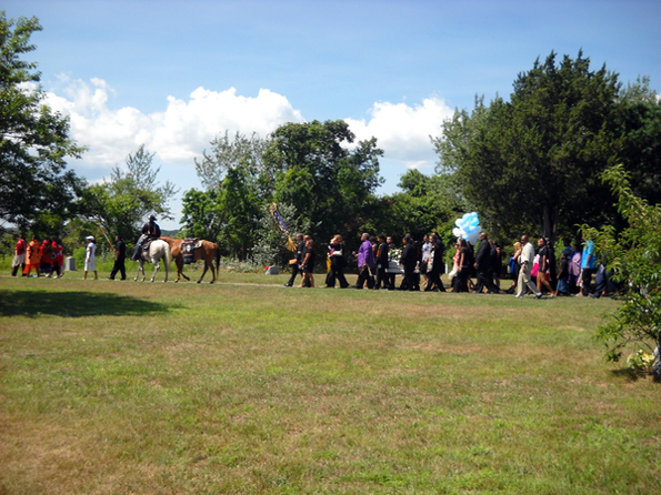 The Shinnecock flag carried by U.S. veteran Susan Soto was followed by a drum group made up of members from several tribes and two horses driven by Eric Phillips. Baby Roy’s grandfather carried the Shinnecock Eagle staff and the family and guests followed. At the end of the graveside service, the line that formed to offer love and condolences to the family was so long, and the family so overwhelmed, that it had to be cut short.