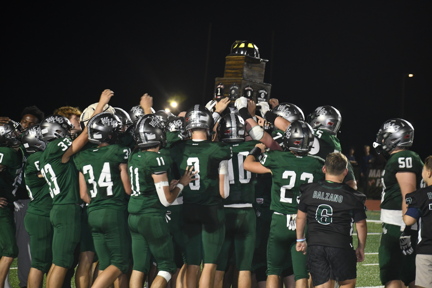 The Hurricanes hoist the Firemans Cup after defeating ESM, 40-19, on Friday night. DREW BUDD