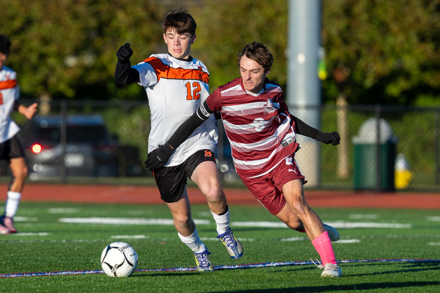 Babylon junior Daniel Murphy and Southampton junior co-captain Max Mobius battle for the ball. RON ESPOSITO/SOUTHAMPTON SCHOOL DISTRICT