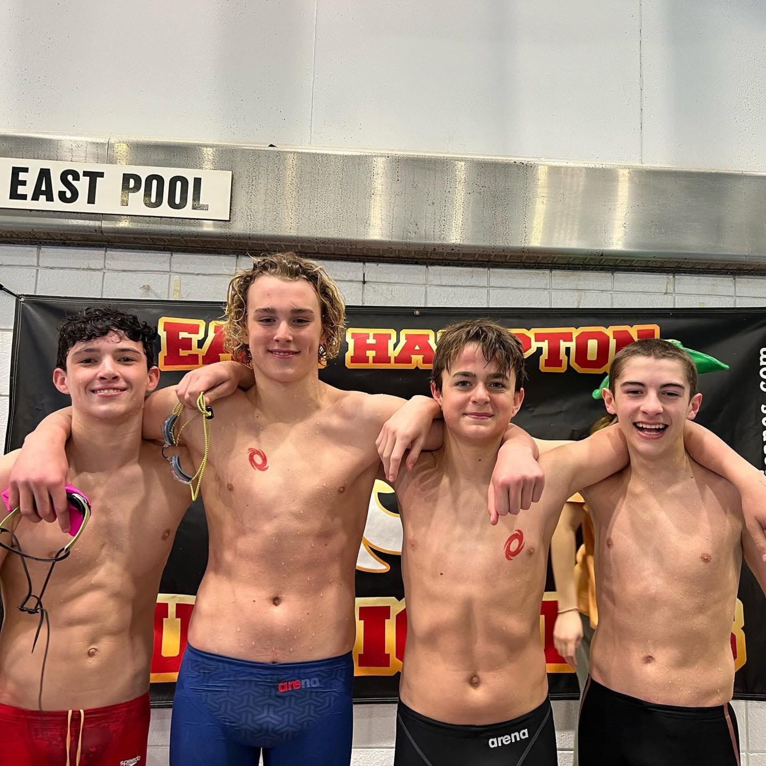 Southampton's Jasiu Gredysa, second from right, is joining his East Hampton Hurricane Club members with the East Hampton boys swim team this winter. FILE PHOTO