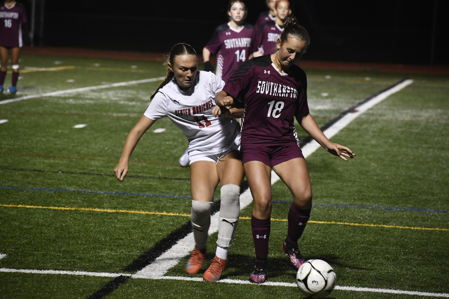 Southampton sophomore Kylee Liebnitzky and Center Moriches sophomore Chloe Szumczyk battle for the ball. Szumczyk scored what ended up being the only goal of the game in the first half. DREW BUDD