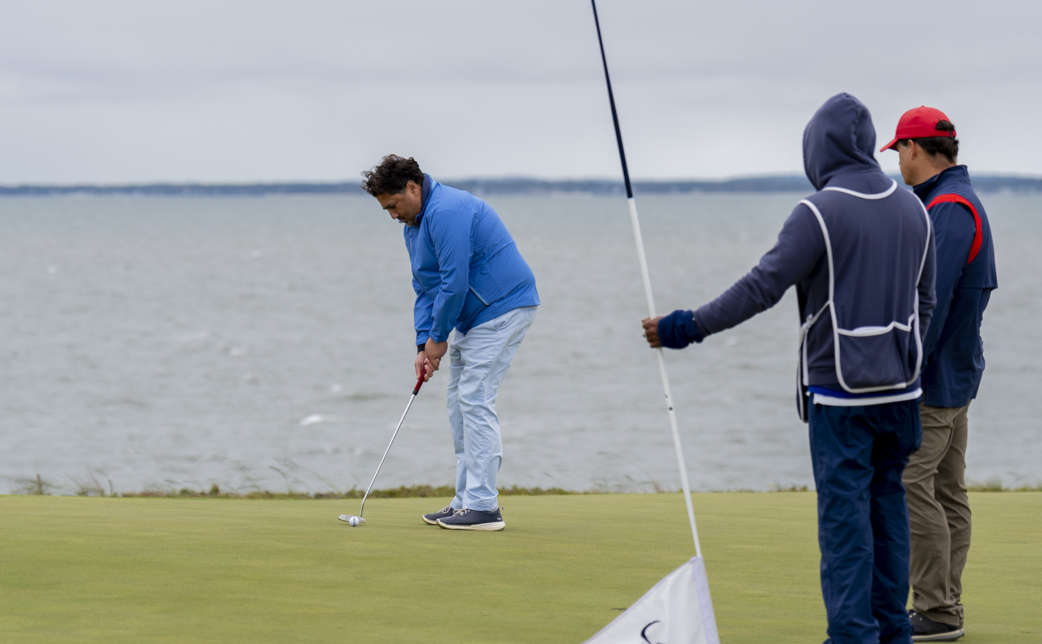 Eric Travis tees off at Sebonack Golf Club. MARK SAGLIOCCO