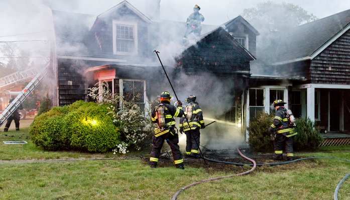 Firefighters from three departments work to put out a fire at 33 Quantuck Bay Lane on Quiogue on Saturday night. COURTESY WESTHAMPTON BEACH FIRE DEPARTMENT
