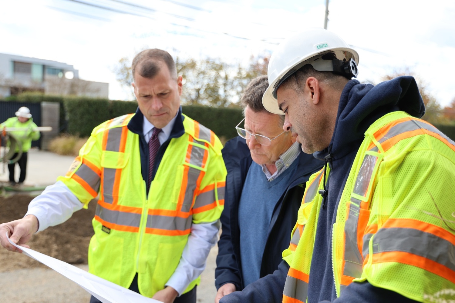 SCWA Chief Executive Officer Jeff Szabo, left, and Quoque Mayor Robert Treuhold review water main replacement work with SCWA Supervisor Anthony D’Angelo, right, on Dune Road in Quogue. COURTESY SUFFOLK COUNTY WATER AUTHORITY